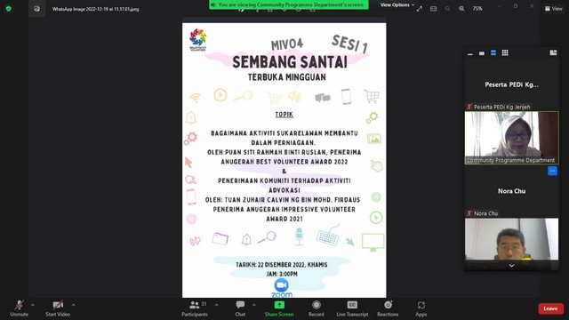 23 Disember 2022 | Aktiviti TerkiniPada 22 Disember 2022, Program sembang santai MIVO 4 : Sukarelawan Untuk Semua 2022 telah diadakan secara maya menggunakan medium aplikasi Zoom. Program berlangsung selama 1 jam dari jam 3.00 petang sehingga 4.00 petang dihadiri oleh sukarelawan MIVO 4 2022 yang telah mendaftar. Topik pada sembang santai ini adalah tentang bagaimana aktiviti sukarelawan membantu dalam perniagaan dan berkongsi serba sedikit tentang perkembangan aktiviti yang telah dijalankan sepanjang tempoh Program MIVO sebelum ini.