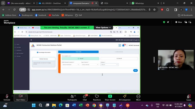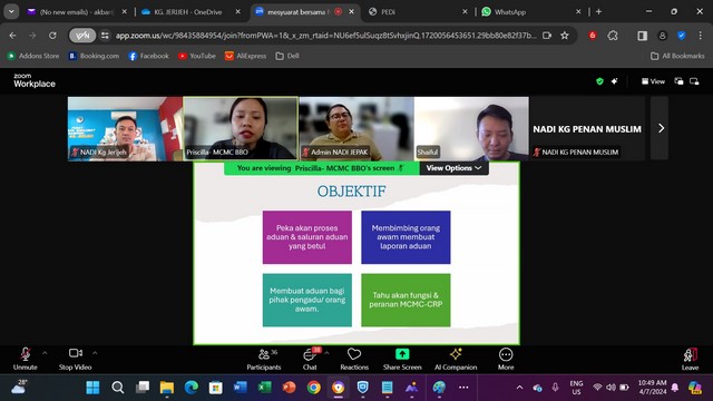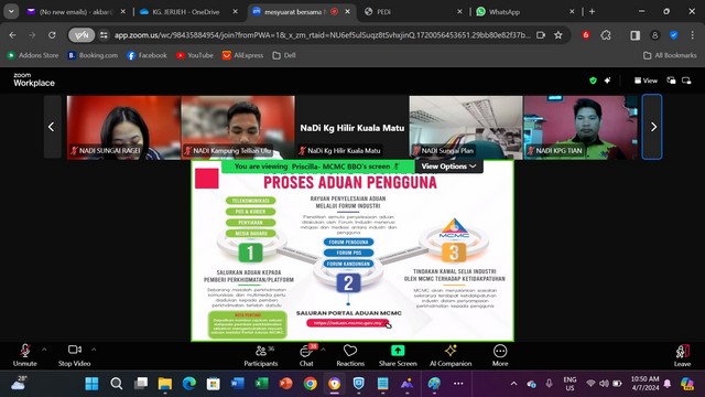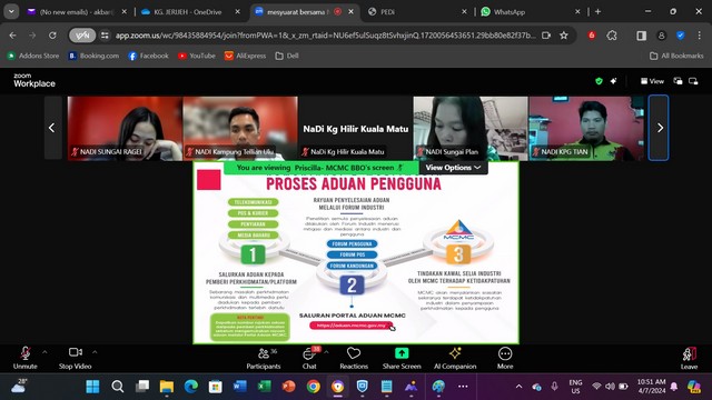 5 Julai 2024 | Aktiviti TerkiniPada 4 Julai 2024, Mesyuarat MCMC Bintulu bersama NADi Kluster Bintulu, Mukah & Dalat, dan TMMD 2024 telah dilaksanakan. Mesyuarat ini diadakan untuk membincangkan secara terperinci peranan NADI dan permasalahan yang timbul serta memberi saranan kepada semua NADI untuk meningkatkan lagi peranan NADI sebagai pusat sebaran maklumat yang penting. Sesi taklimat tentang portal aduan turut diselit bagi memberi pendedahan kepada staf untuk mengetahui cara untuk membuat aduan yang betul dan mengikut langkah yang sepatutnya. Mesyuarat ini diadakan menggunakan aplikasi Zoom Meet yang berlangsung sekitar jam 9.30 pagi sehingga 12.30 petang.