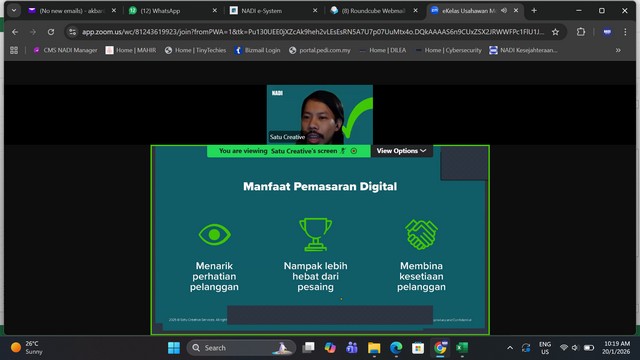 21 Januari 2026 | Aktiviti TerkiniPada 20 Januari 2026, Program e-Kelas : Strategi Pemasaran Digital secara atas talian telah diadakan di NADI Kg Jerijeh. Program ini adalah inisiatif Maxis eKelas Usahawan yang dijalankan di bawah kerjasama antara Maxis dan NADI. Program ini bertujuan untuk memperkasakan usahawan tempatan dengan kemahiran digital, terutamanya dalam mengetahui strategi pemasaran digital yang berkesan dan mampu memberi impak kepada peniagaan. Program ini berlangsung sekitar jam 10.00 pagi sehingga 11.00 pagi.